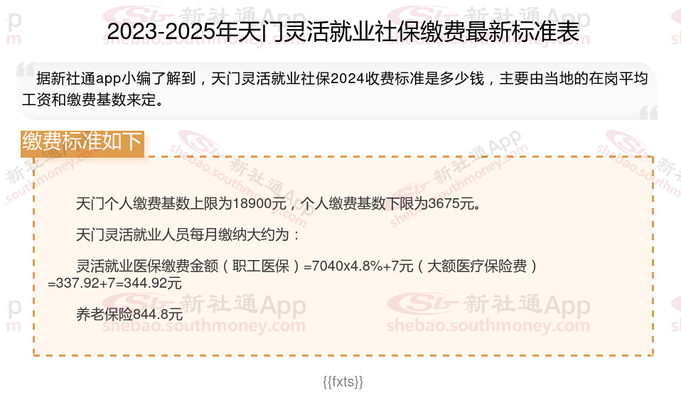 据新社通app数据显示,天门灵活就业养老保险的缴费基数为:3675元。灵活就业人员参保缴费的比例为个人20%。