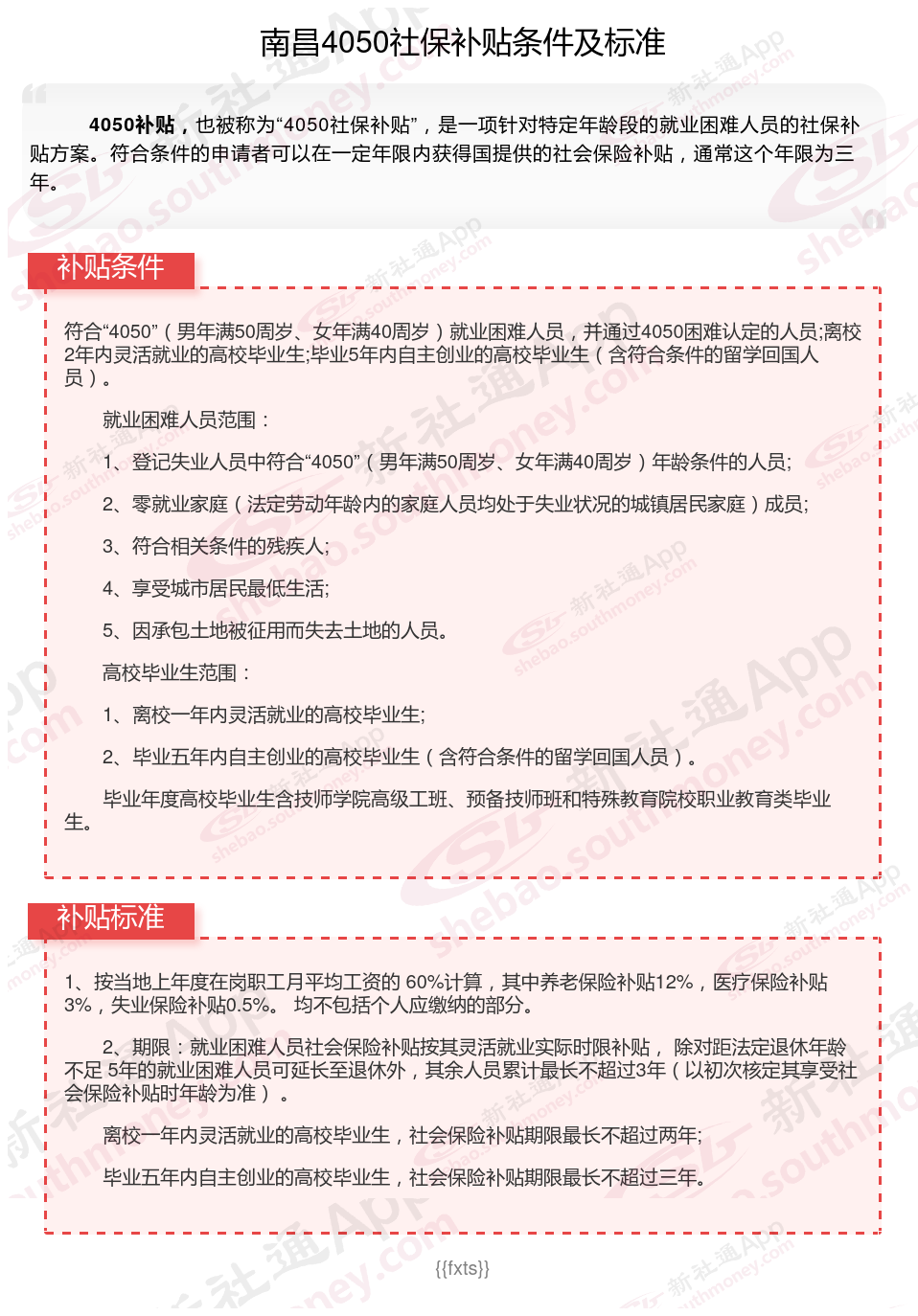 今天聊一下4050补贴话题。4050补贴听起来像是一个针对特定年龄人群的社保补贴。比如女性需年满40周岁,男性需年满50周岁(以申请当年12月31日为截止日期)。那么南昌4050灵活就业社保补贴标准是多少钱?南昌4050社保补贴条件是什么?接下来随新社通APP小编了解一下最新资讯。