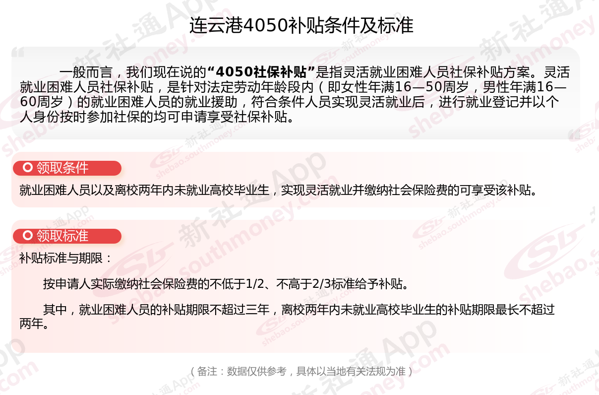 以上就是连云港4050灵活就业困难人员社保补贴的相关内容,欢迎关注新社通/下载新社通APP了解更多五险一金专业资讯。