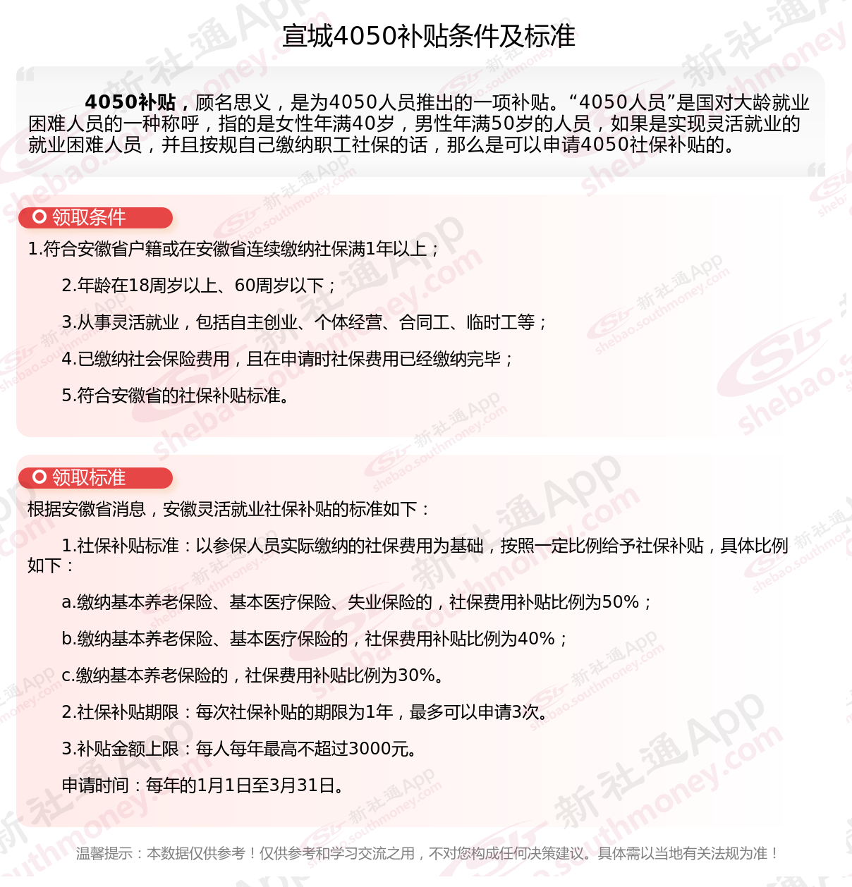 今天聊一下4050补贴话题。4050补贴听起来像是一个针对特定年龄人群的社保补贴。比如女性需年满40周岁,男性需年满50周岁(以申请当年12月31日为截止日期)。那么宣城4050灵活就业社保补贴标准是多少钱?宣城4050社保补贴条件是什么?接下来随新社通APP小编了解一下最新资讯。