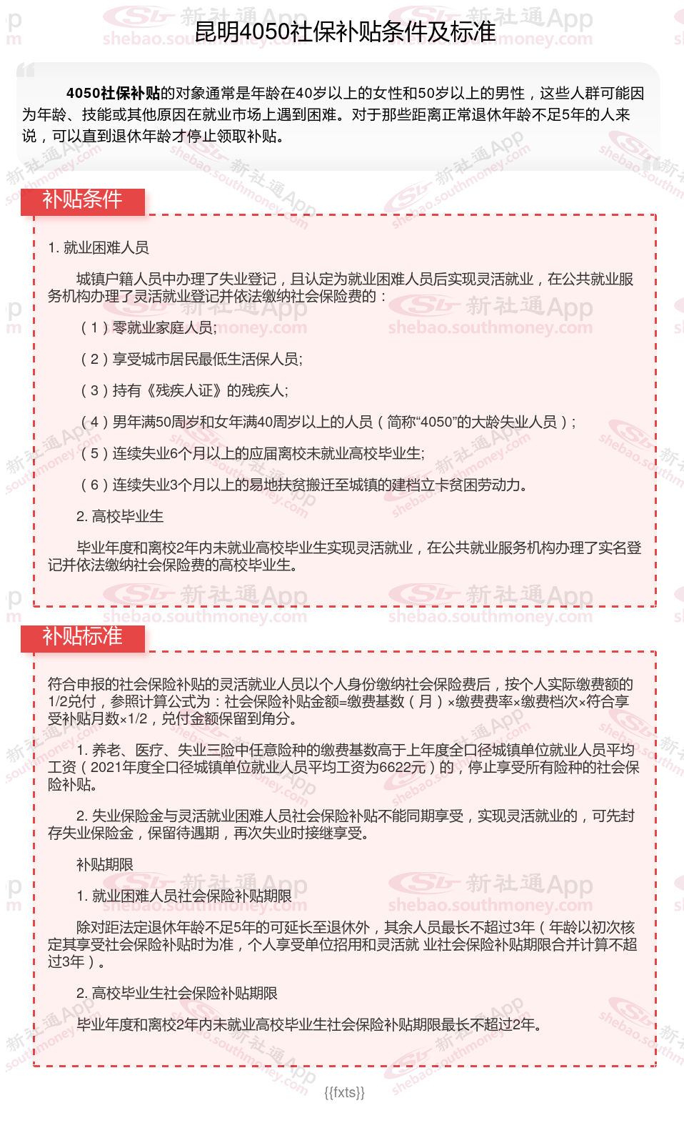 以上就是昆明4050灵活就业社保补贴的相关内容,欢迎关注新社通/下载新社通APP了解更多五险一金专业资讯。