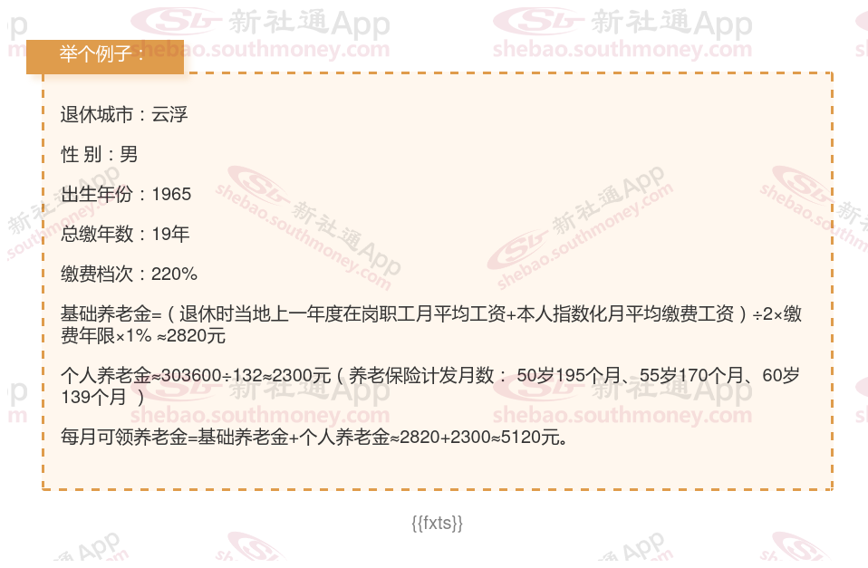 退休城市:云浮,性别:男,出生年份:1965,总缴年数19年,缴费档次:220%,新社通app养老金计算器所得: