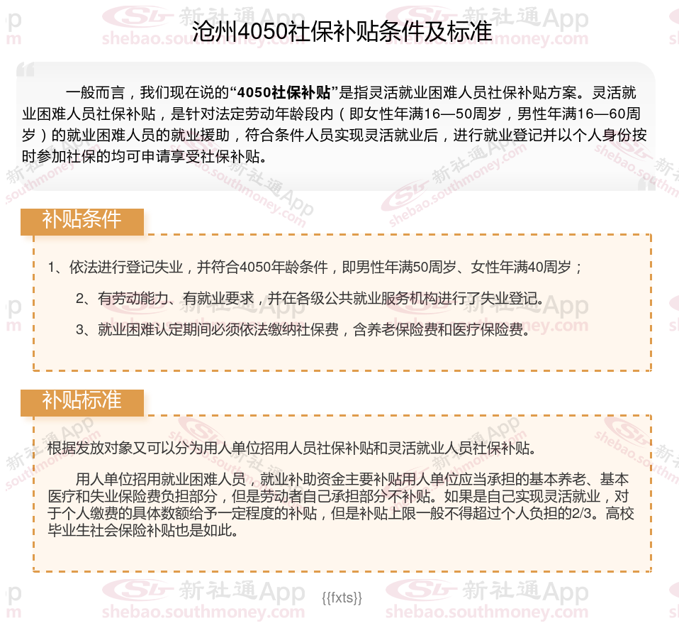 二、2025年沧州4050社保补贴标准及条件,最新如下: