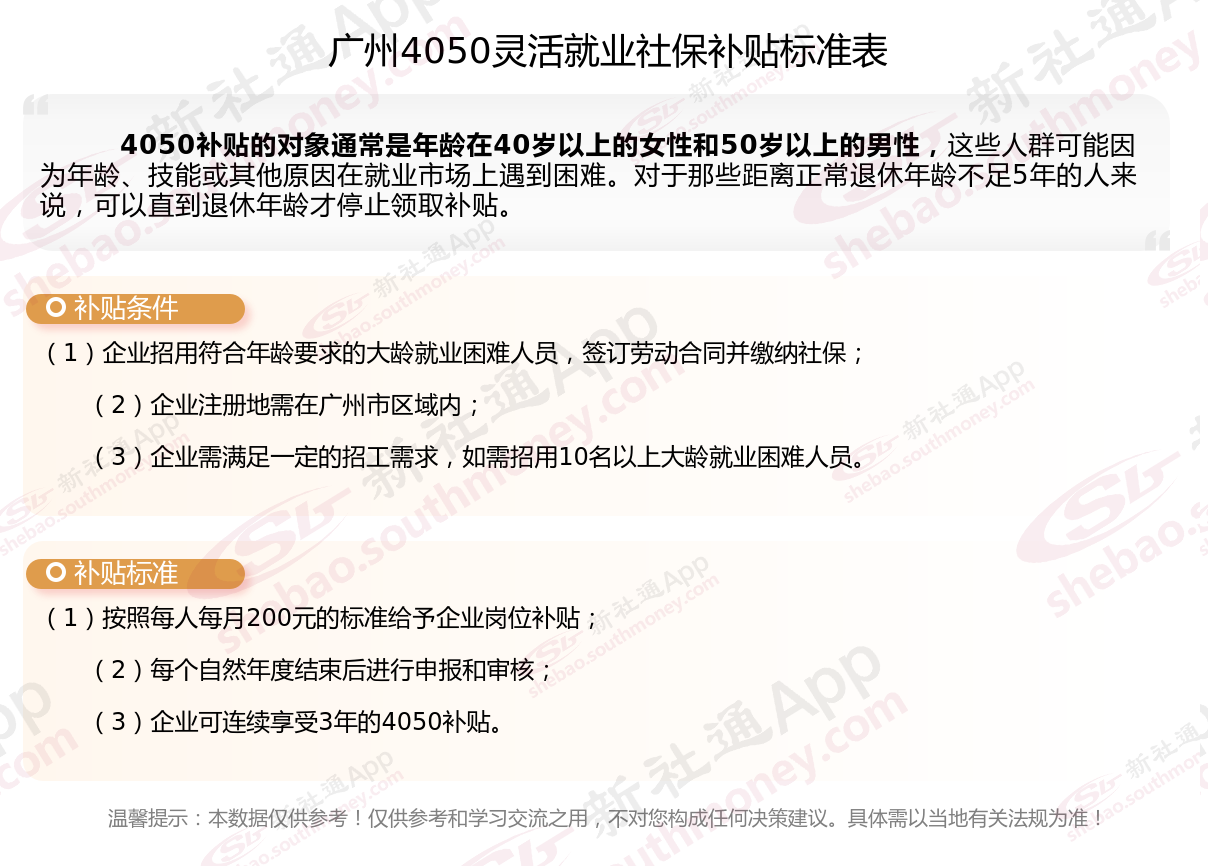 2025广州4050补贴主要针对的是年龄在40岁以上的女性和50岁以上的男性,这些人群通常因为年龄较大而面临就业困难。