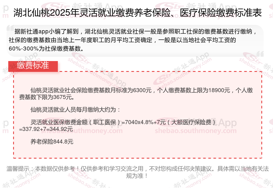 那么,湖北仙桃灵活就业人员社保一个月多少钱?根据新社通app-社保缴费查询工具提供的2025社保缴费标准详情数据: