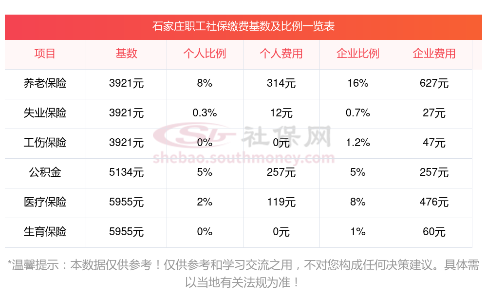 2025年石家庄5险缴费标准是多少,2025年石家庄社保缴费多少钱?下表是2025年石家庄社保费用明细参考,新社通app-社保缴费查询工具提供的最新数据如下:
