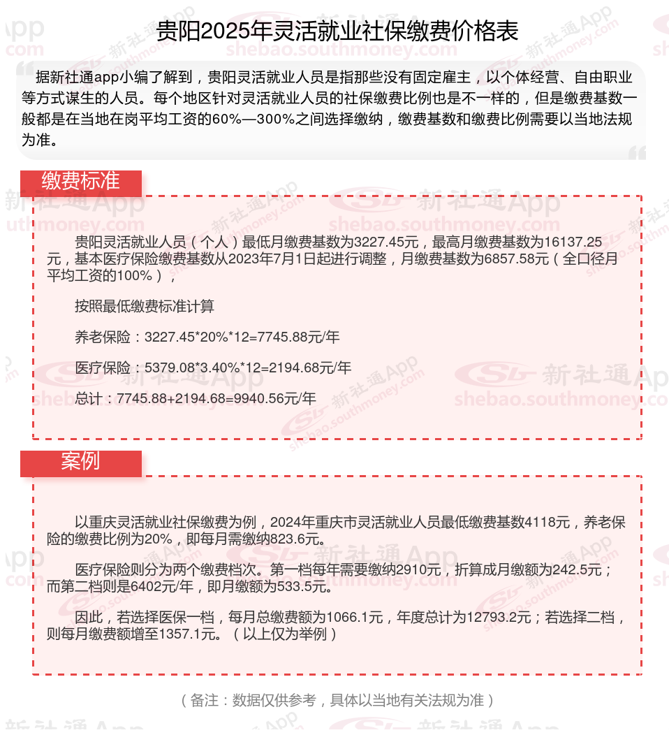 随着经济社会的不断发展,灵活就业群体日益壮大,其社保缴费问题也愈发受到关注。接下来随社保君了解一下2025年贵阳灵活就业人员社保交多少钱的详细内容。