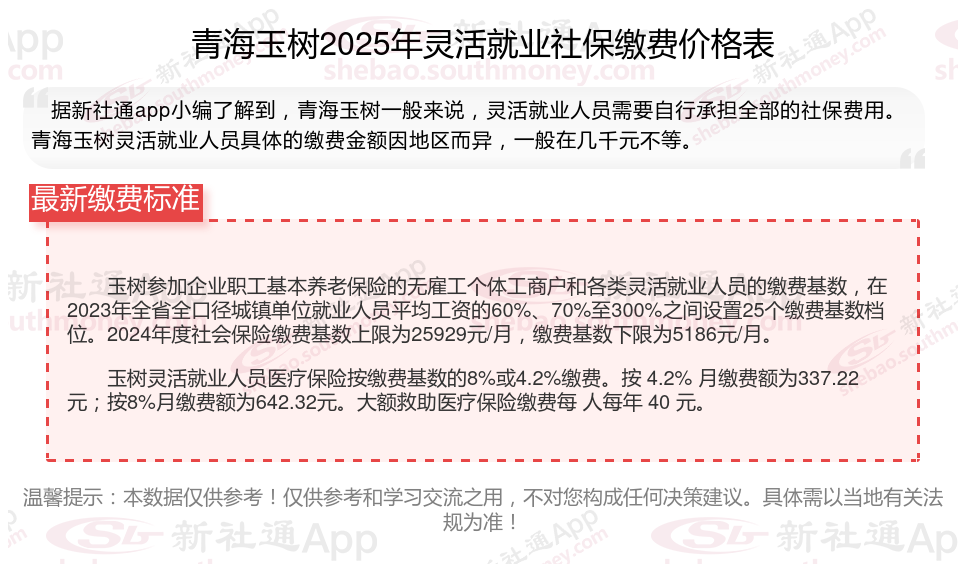 青海玉树灵活就业者社保缴纳金额怎么计算?根据新社通app-社保缴费查询工具提供的最新数据如下: