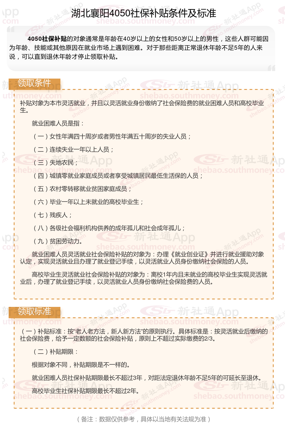 2025湖北襄阳灵活就业4050社保补贴是一项面向特定年龄段的就业困难人群的社会保险补贴。