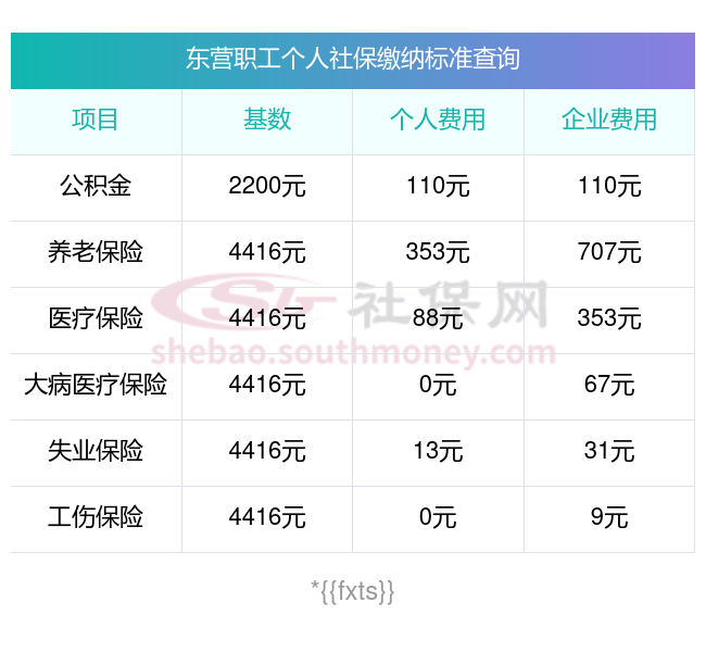 2025年东营社保缴费最低基数及个人和单位具体是多少钱?下表是2025年东营社保费用明细参考,新社通app-社保缴费查询工具提供的最新数据如下: