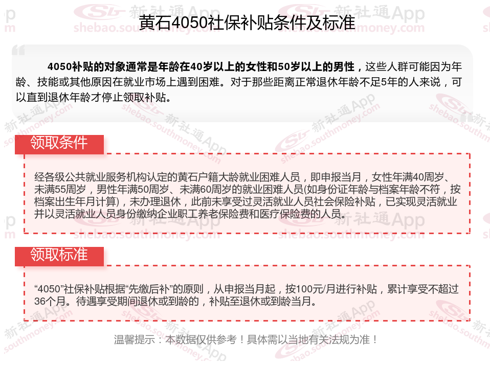 二、黄石4050社保补贴标准及条件4050社保补贴,最新如下