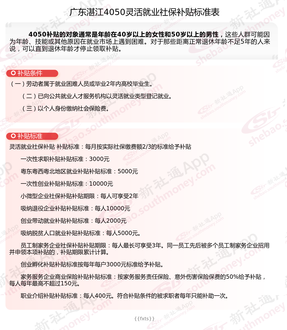 以上就是广东湛江4050灵活就业社保补贴的相关内容,欢迎关注新社通/下载新社通APP了解更多五险一金专业资讯。