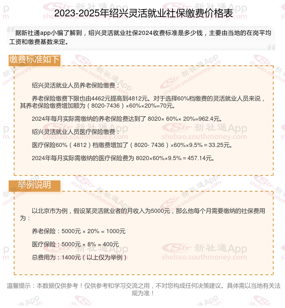 绍兴社保缴费多少钱?下表是2024-2025年绍兴社保费用明细参考,根据新社通app-社保缴费查询工具提供的最新数据如下:
