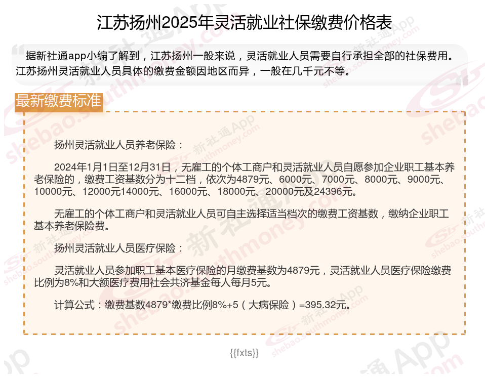 据新社通app数据显示,江苏扬州灵活就业人员养老缴费基数2024-2025年最新标准如下: