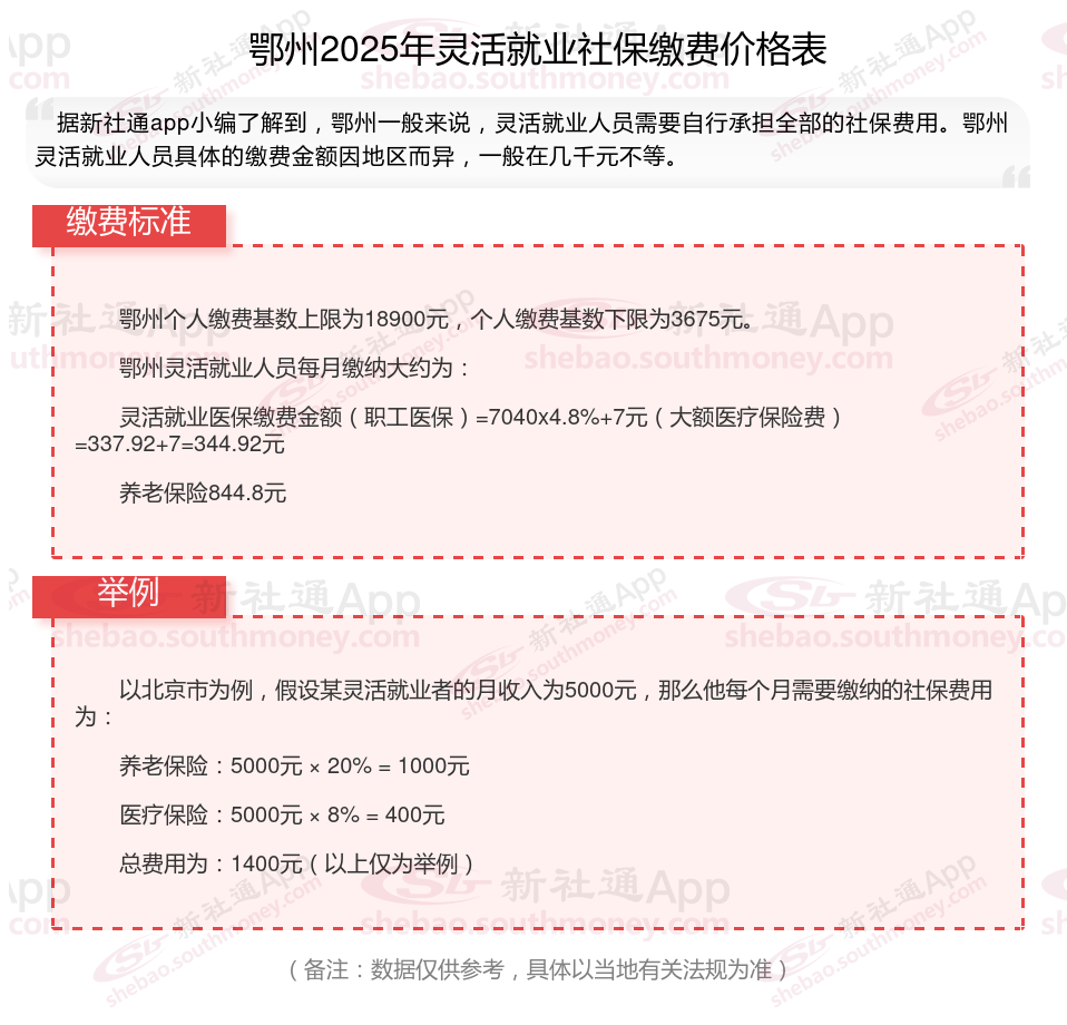 2025年鄂州城镇职工社会保险缴费基数用人单位及其职工(包括有雇工的个体工商户及其雇工)分别按2024年度全口径省平的60%(3675元/月)和300%(18900元/月)核定缴费基数的下限和上限执行。