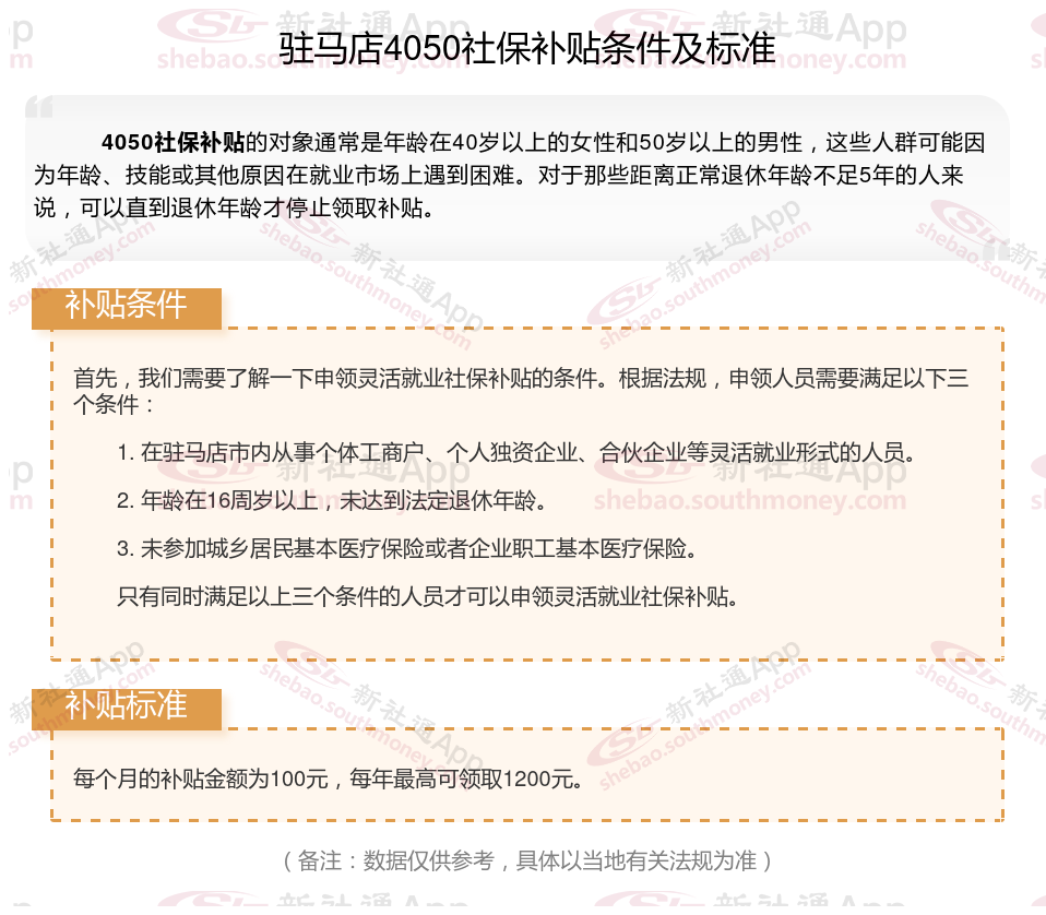 二、2025年驻马店4050社保补贴标准及条件,最新如下: