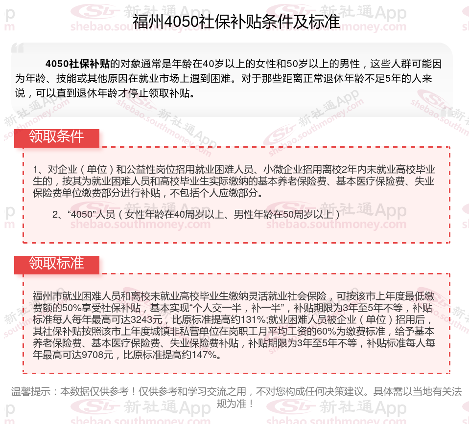今天聊一下4050补贴话题。4050补贴听起来像是一个针对特定年龄人群的社保补贴。比如女性需年满40周岁,男性需年满50周岁(以申请当年12月31日为截止日期)。那么福州4050灵活就业社保补贴标准是多少钱?福州4050社保补贴条件是什么?接下来随新社通APP小编了解一下最新资讯。