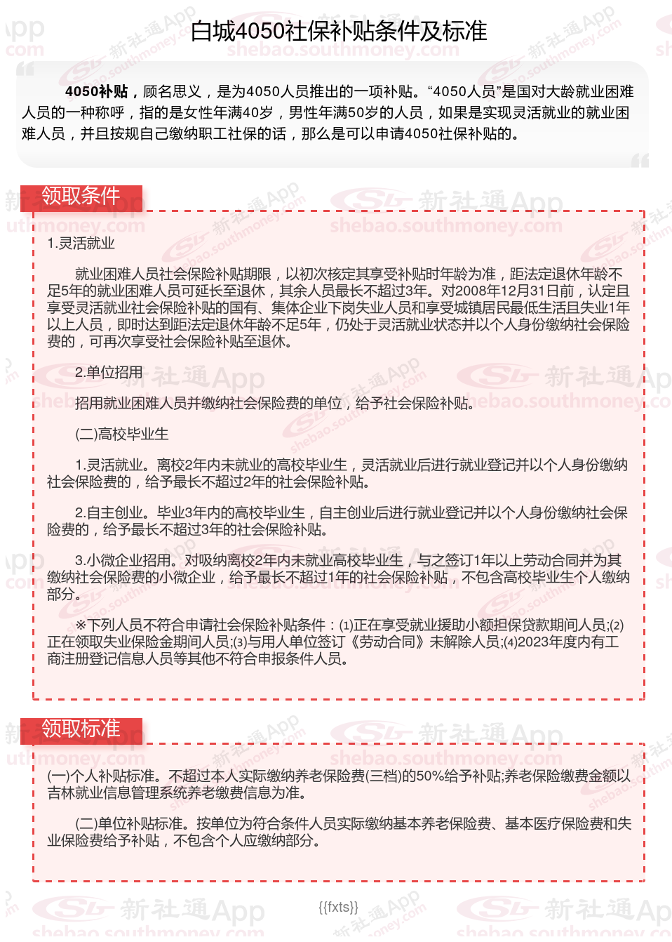 2025白城4050补贴标准是多少钱一个月?白城4050补贴到账哪里查询到账?2025白城4050补贴主要针对的是年龄在40岁以上的女性和50岁以上的男性,这些人群通常因为年龄较大而面临就业困难。