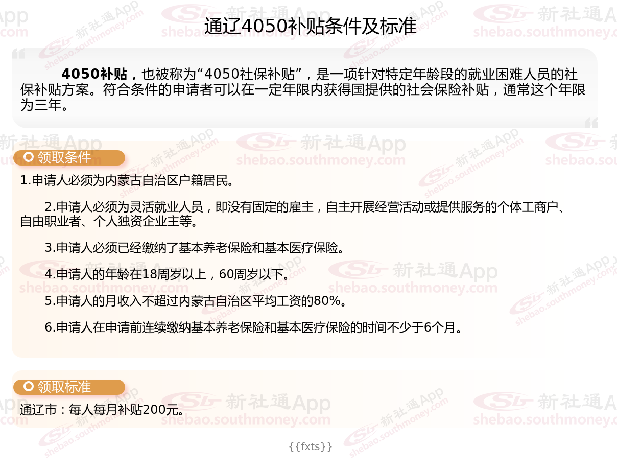 二、2025年通辽4050社保补贴标准及条件,最新如下: