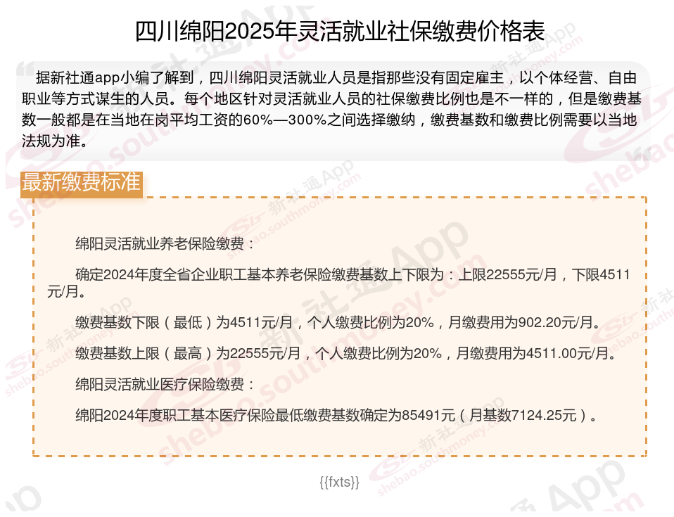据新社通app数据显示,四川绵阳灵活就业养老保险的缴费基数为:4511元。灵活就业人员参保缴费的比例为个人20%。