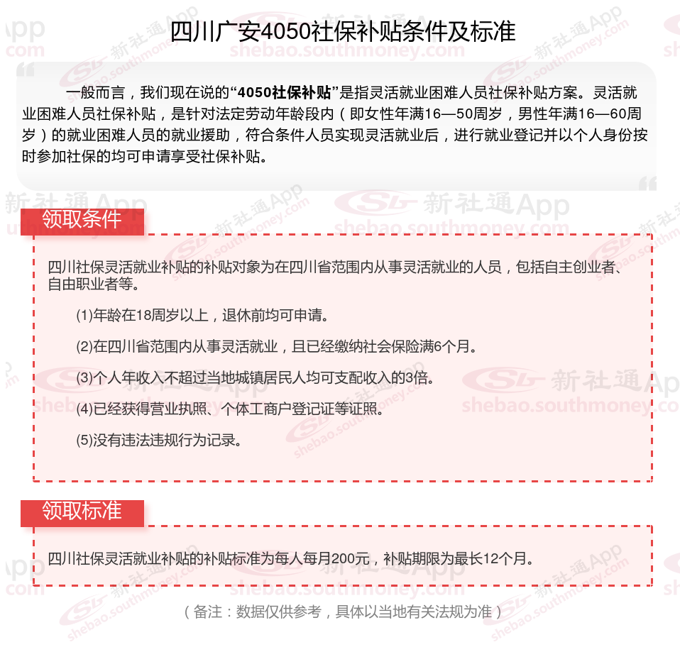 四川广安4050灵活就业社保补贴标准如何?“4050补贴”主要是针对大龄就业困难人群的社保补贴,申请条件包括年龄、就业困难、灵活就业并自费缴纳社保,需要持有失业登记证,不同地区可能有细微差别,比如农村户口的限制。那么四川广安4050灵活就业社保补贴标准是多少钱?四川广安4050社保补贴条件是什么?接下来随新社通APP小编了解一下四川广安4050灵活就业社保补贴标准最新资讯。
