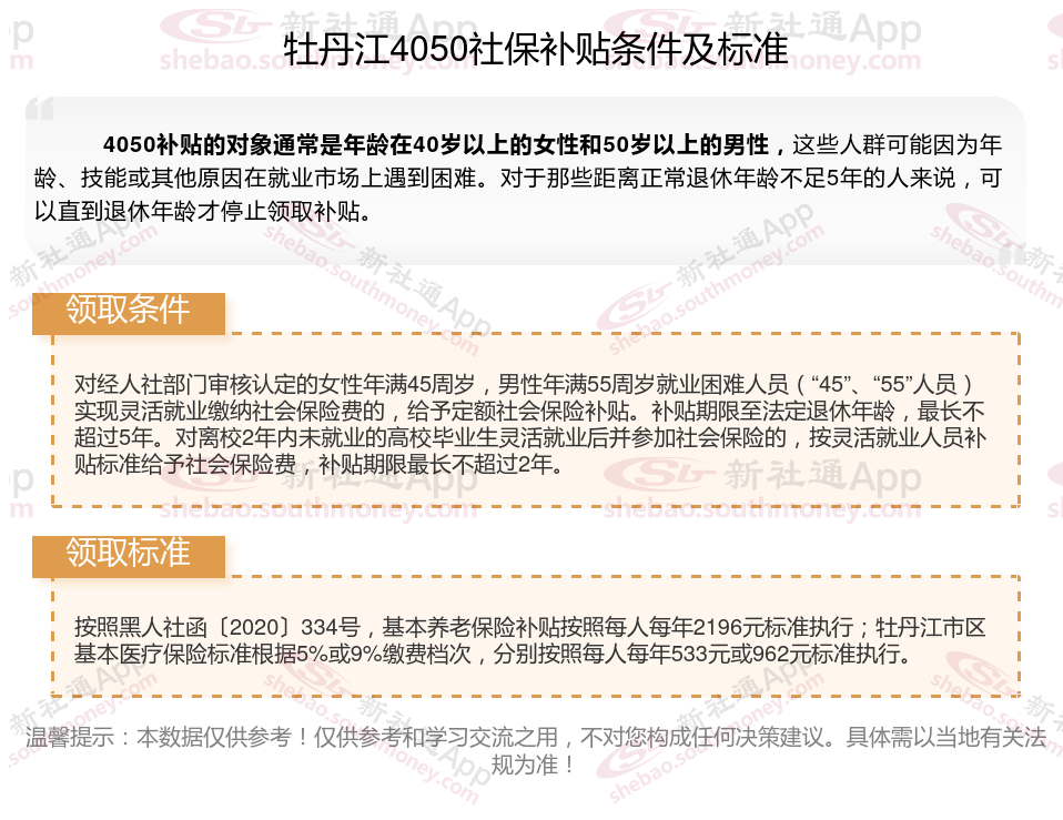 二、2025年牡丹江4050社保补贴标准及条件,最新如下: