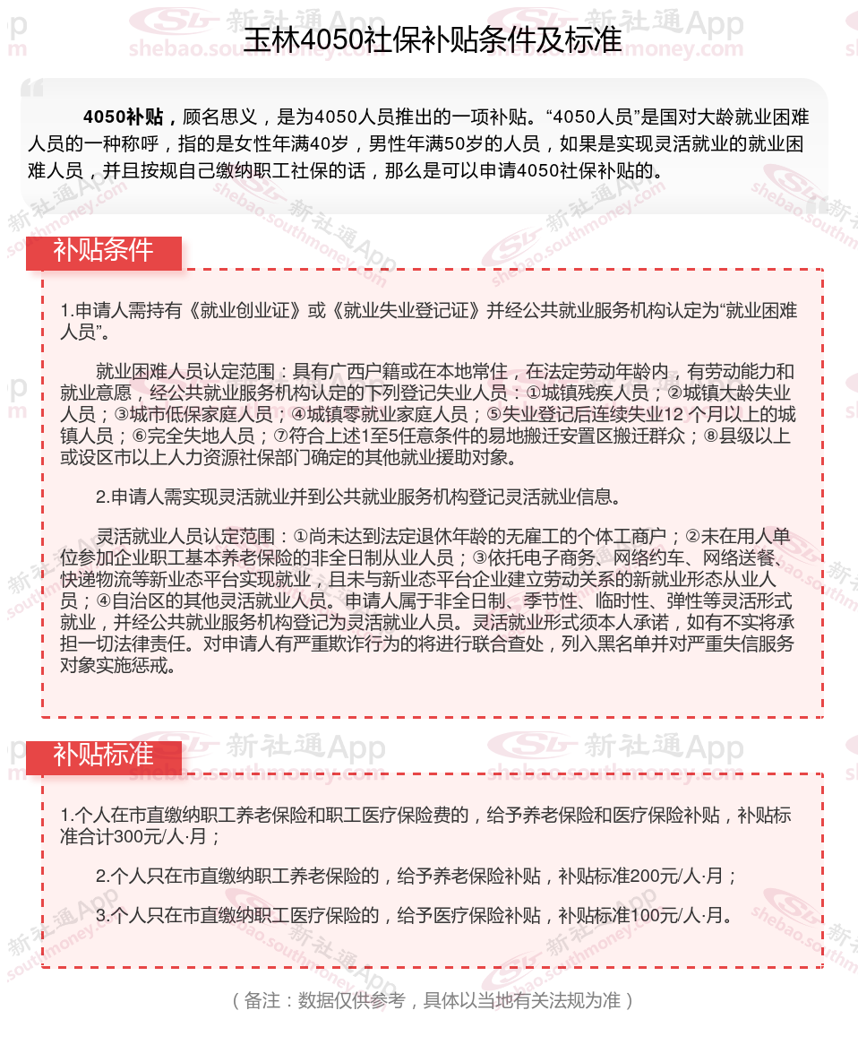 今天聊一下4050补贴的相关内容。4050补贴听起来像是一个针对特定年龄人群的社保补贴。比如女性需年满40周岁,男性需年满50周岁(以申请当年12月31日为截止日期)。那么玉林4050灵活就业困难人员社保补贴多少钱?玉林4050社保补贴可以申请吗?接下来随新社通APP小编具体了解一下4050社保补贴内容。