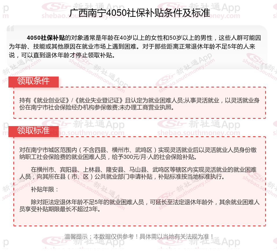 广西南宁4050灵活就业社保补贴是什么?今天聊一下4050补贴话题。44050社保补贴标准据新社通app小编了解,通常,4050社保补贴包含基本医疗保险和基本养老保险两个险种,社保补贴金额为申请人实际缴纳基本养老保险和基本医疗保险金额的2/3,具体标准以当地社保局公布的数据为准!那么广西南宁4050灵活就业社保补贴标准是多少钱?广西南宁4050社保补贴可以领取多少?接下来随新社通APP小编了解一下广西南宁4050灵活就业社保补贴的最新资讯。