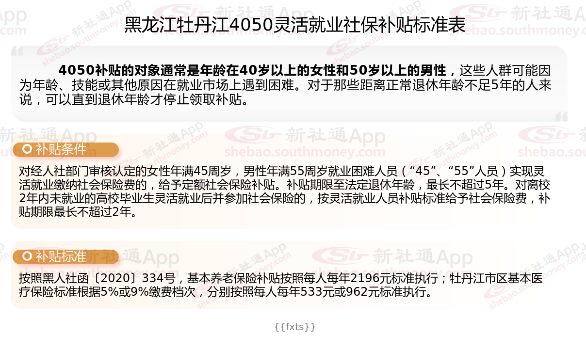 二、2025年黑龙江牡丹江4050社保补贴标准及条件,最新如下: