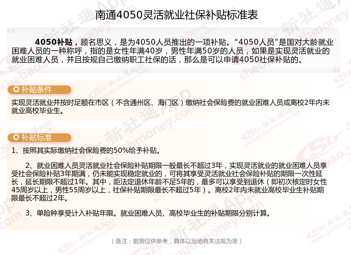 二、2025年南通4050社保补贴标准(南通4050灵活就业人员补贴标准是多少钱?南通2025年4050补贴新规能领多少钱?)