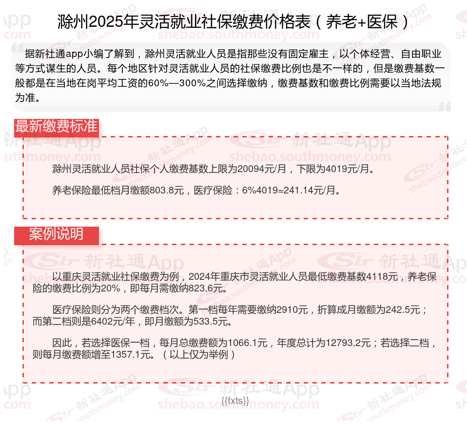 在滁州,那些选择独立参保的灵活就业者,包括个体户和自由职业者,现在有机会加入企业职工基本养老保险体系。根据法规,这些参保者可以根据自身情况,在全省城镇单位就业人员平均工资的60%至300%范围内,挑选最适合自己的缴费基数。那么,关于滁州2025年灵活就业人员的社保缴费标准是多少?以及每月需要缴纳的社保费用是多少,本文将为您提供最新的信息。