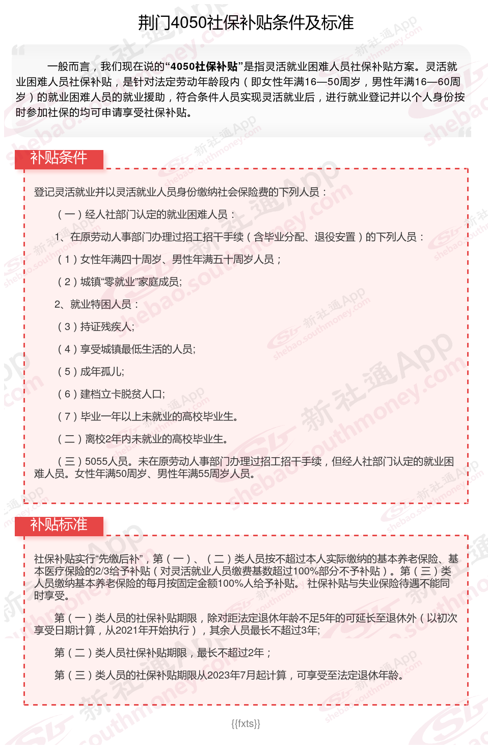 二、2025年荆门4050社保补贴标准是多少?条件是什么?
