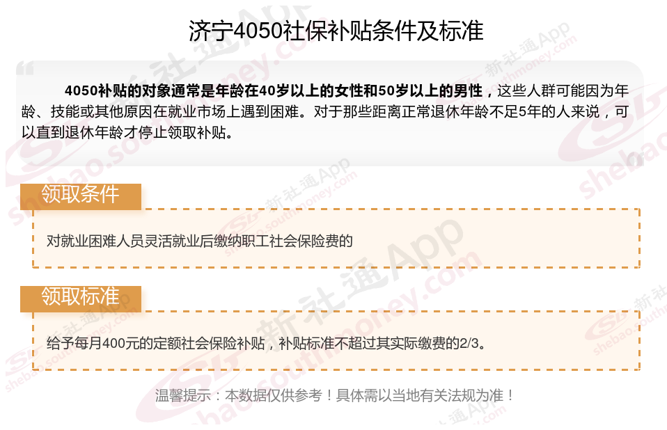 2025济宁4050补贴标准是多少钱一个月?济宁4050补贴到账哪里查询到账?2025济宁4050补贴主要针对的是年龄在40岁以上的女性和50岁以上的男性,这些人群通常因为年龄较大而面临就业困难。