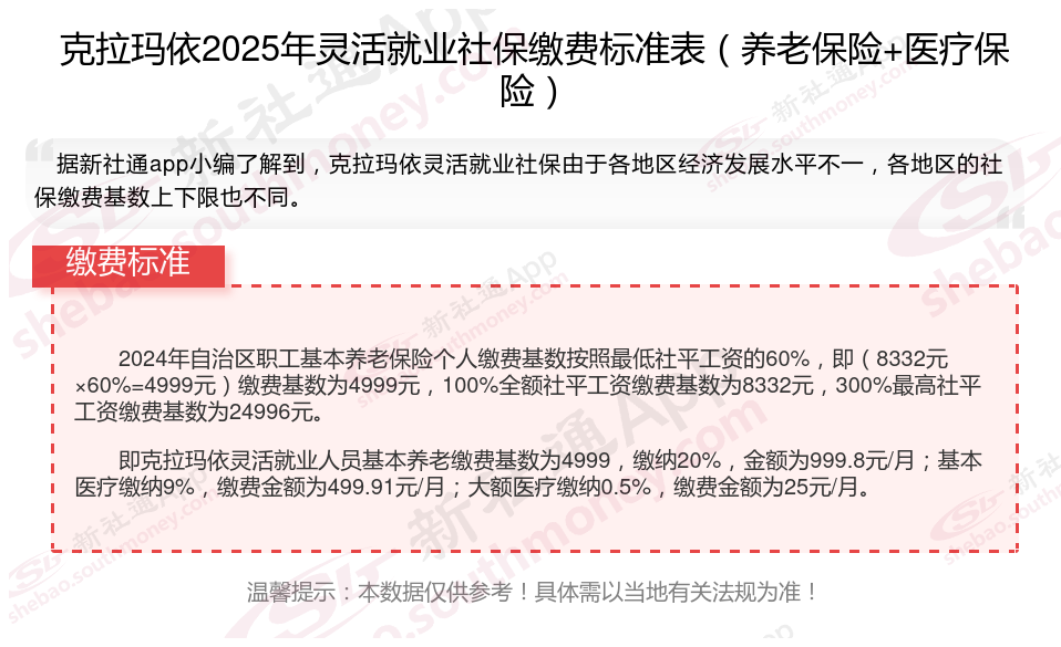 克拉玛依社保缴费多少钱?下表是2024-2025年克拉玛依社保费用明细参考,根据新社通app-社保缴费查询工具提供的最新数据如下: