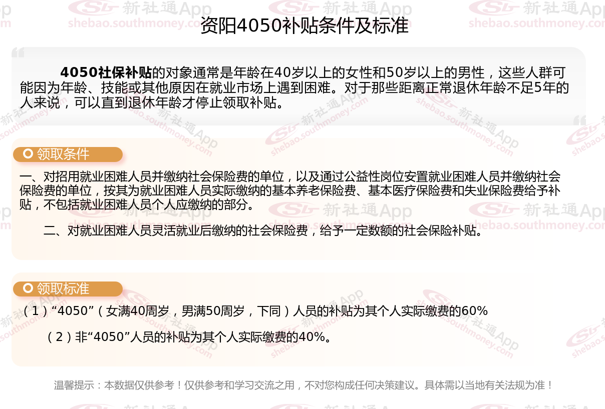 二、2025年资阳4050社保补贴标准是多少?领取条件是什么?