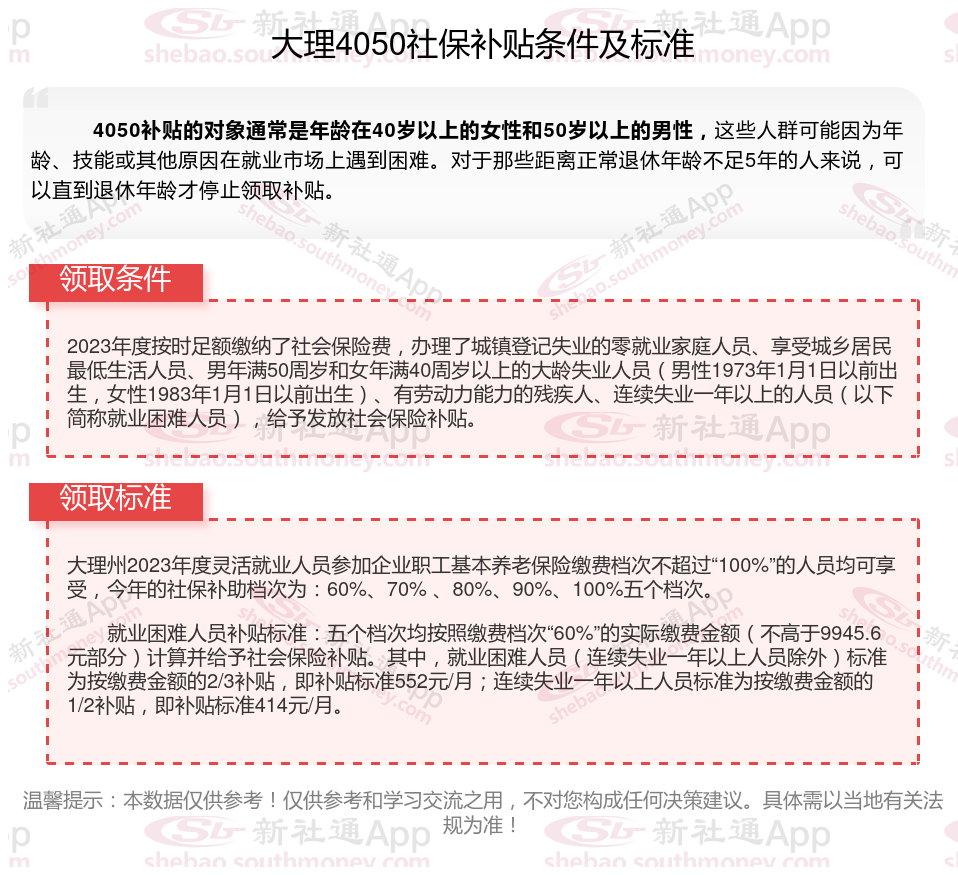 一、2023-2024年大理4050社保补贴标准及条件,最新如下