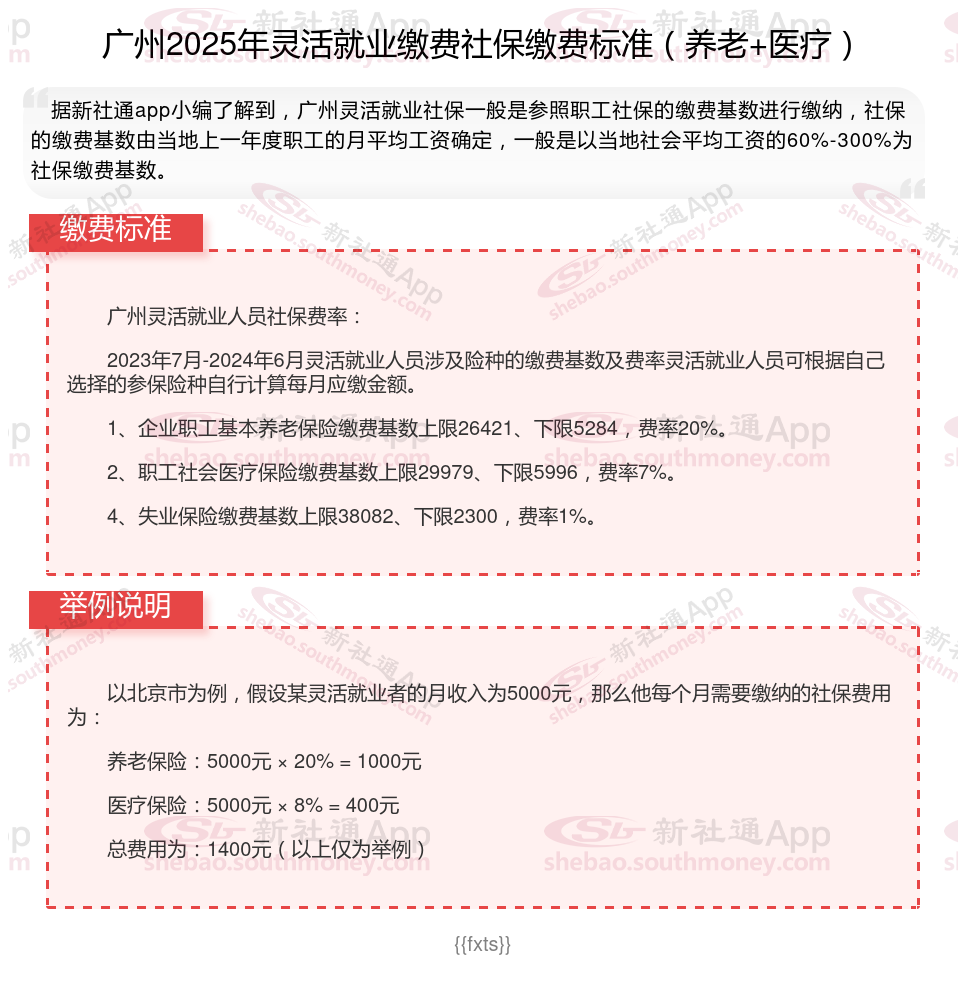 据新社通app数据显示,2024-2025年广州灵活就业人员养老保险的缴费标准是根据缴费基数来确定的: