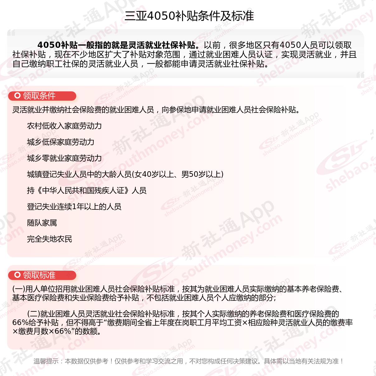 二、2025年三亚4050社保补贴标准及条件,最新如下: