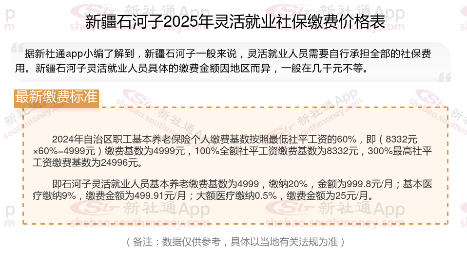 即石河子灵活就业人员基本养老缴费基数为4999,缴纳20%,金额为999.8元/月;基本医疗缴纳9%,缴费金额为499.91元/月;大额医疗缴纳0.5%,缴费金额为25元/月。