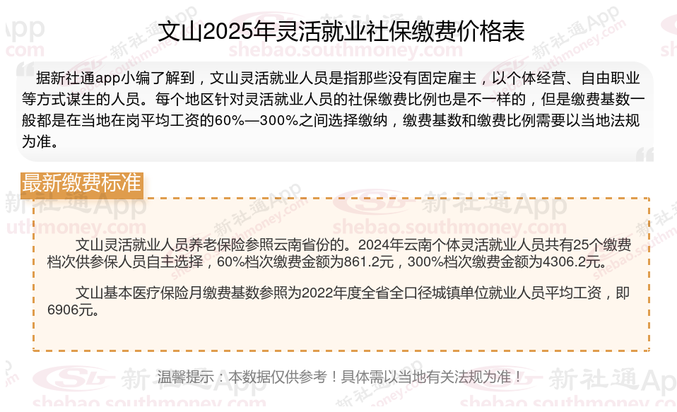 随着经济社会的不断发展,灵活就业群体日益壮大,其社保缴费问题也愈发受到关注。接下来随社保君了解一下2025年文山灵活就业人员社保交多少钱的详细内容。