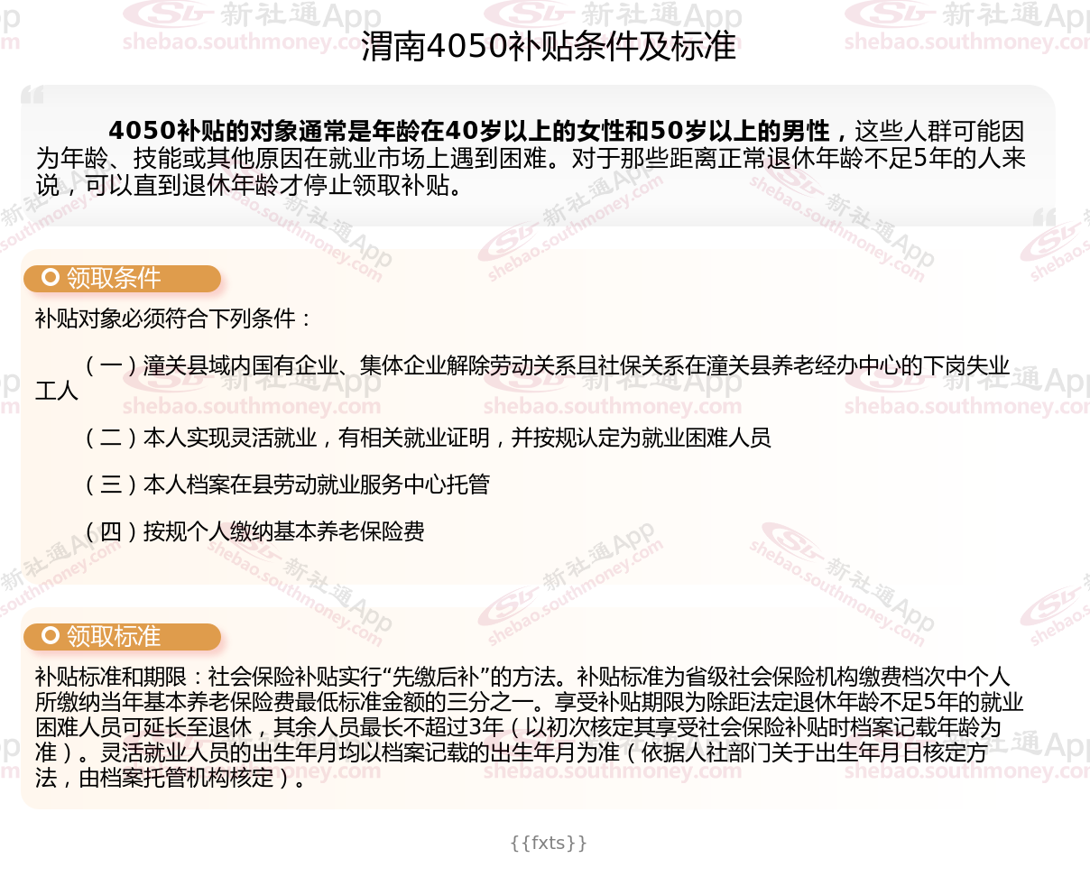二、2025年渭南4050社保补贴标准及条件,最新如下: