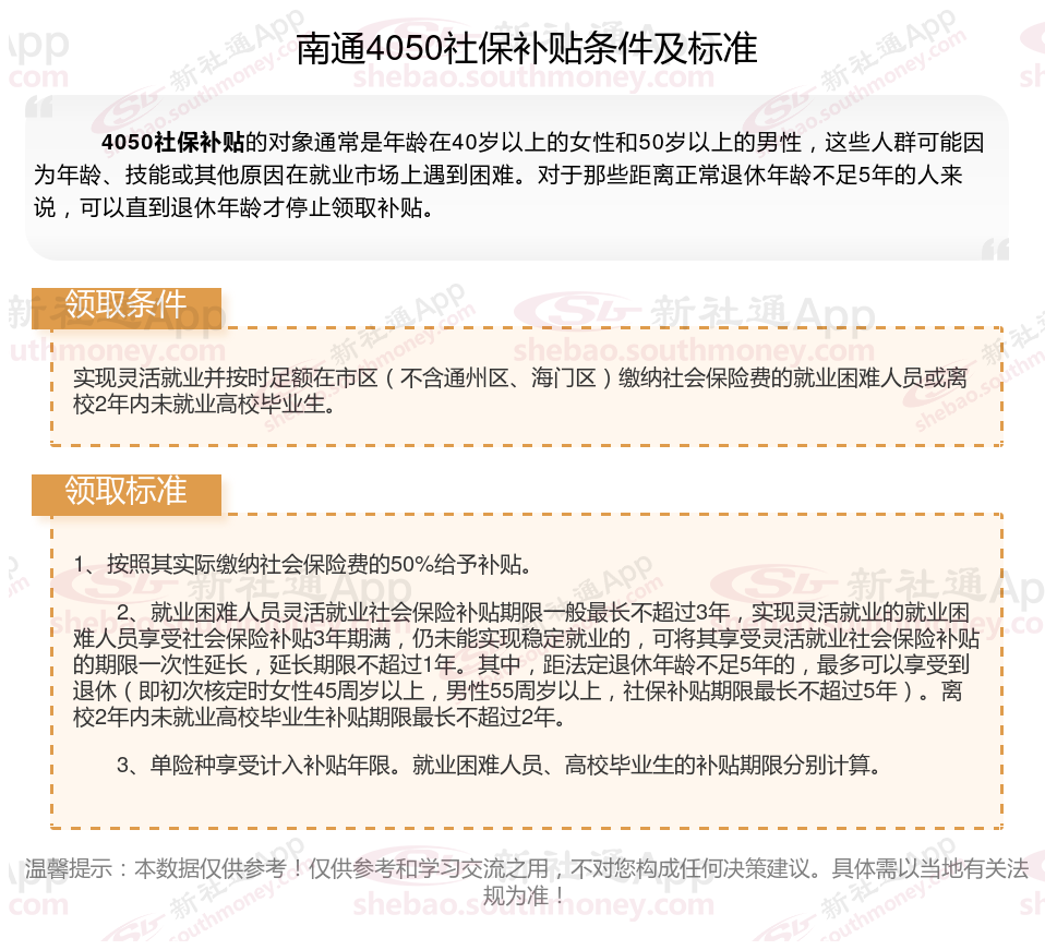 2025南通4050补贴主要针对的是年龄在40岁以上的女性和50岁以上的男性,这些人群通常因为年龄较大而面临就业困难。