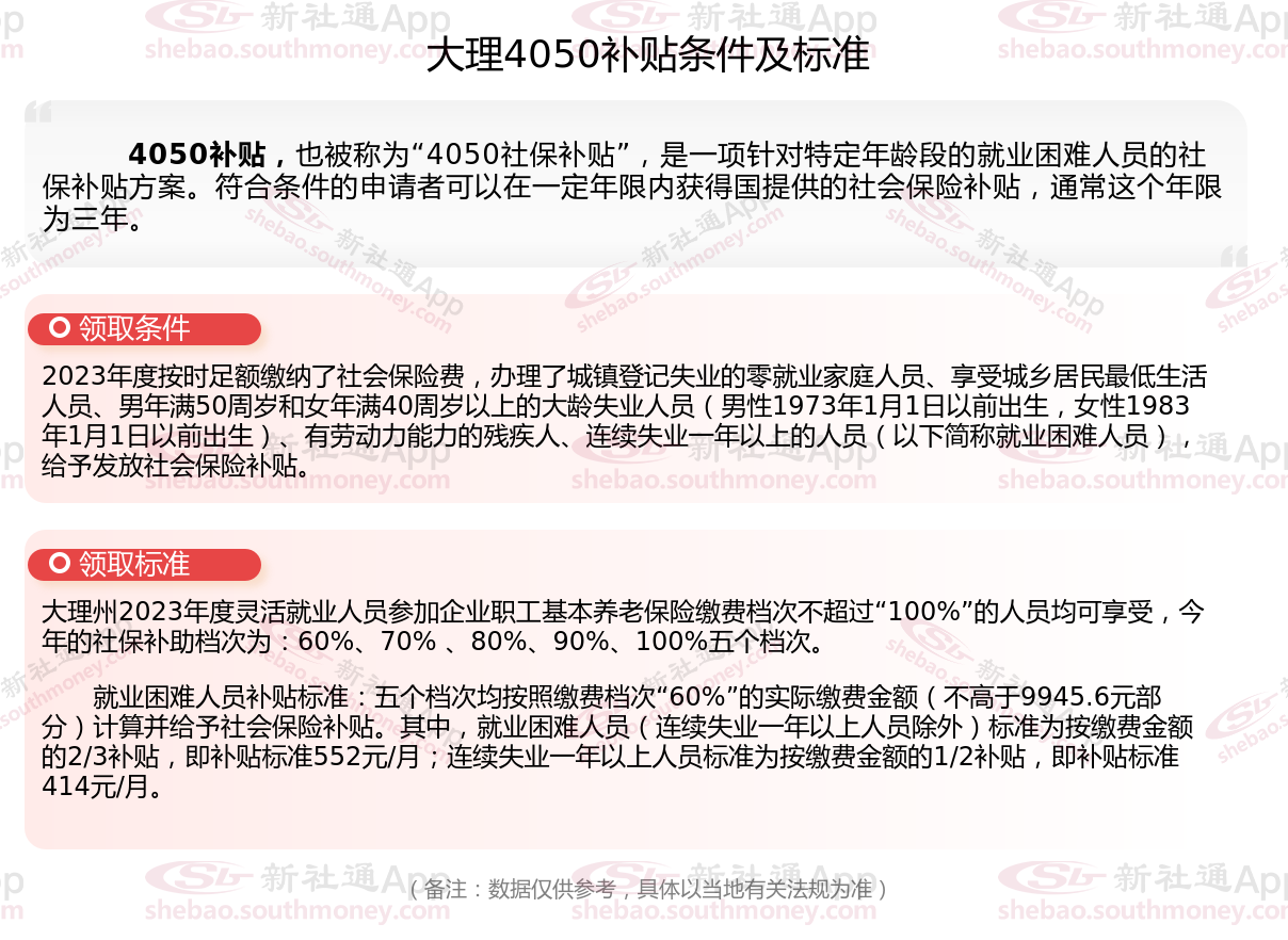 2025大理4050补贴主要针对的是年龄在40岁以上的女性和50岁以上的男性,这些人群通常因为年龄较大而面临就业困难。