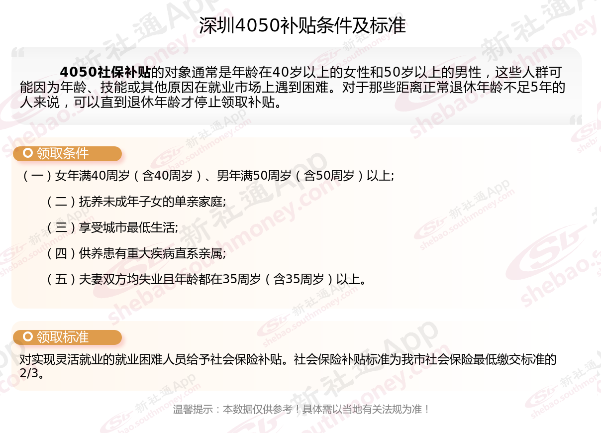 二、2025年深圳4050社保补贴标准及条件,最新如下: