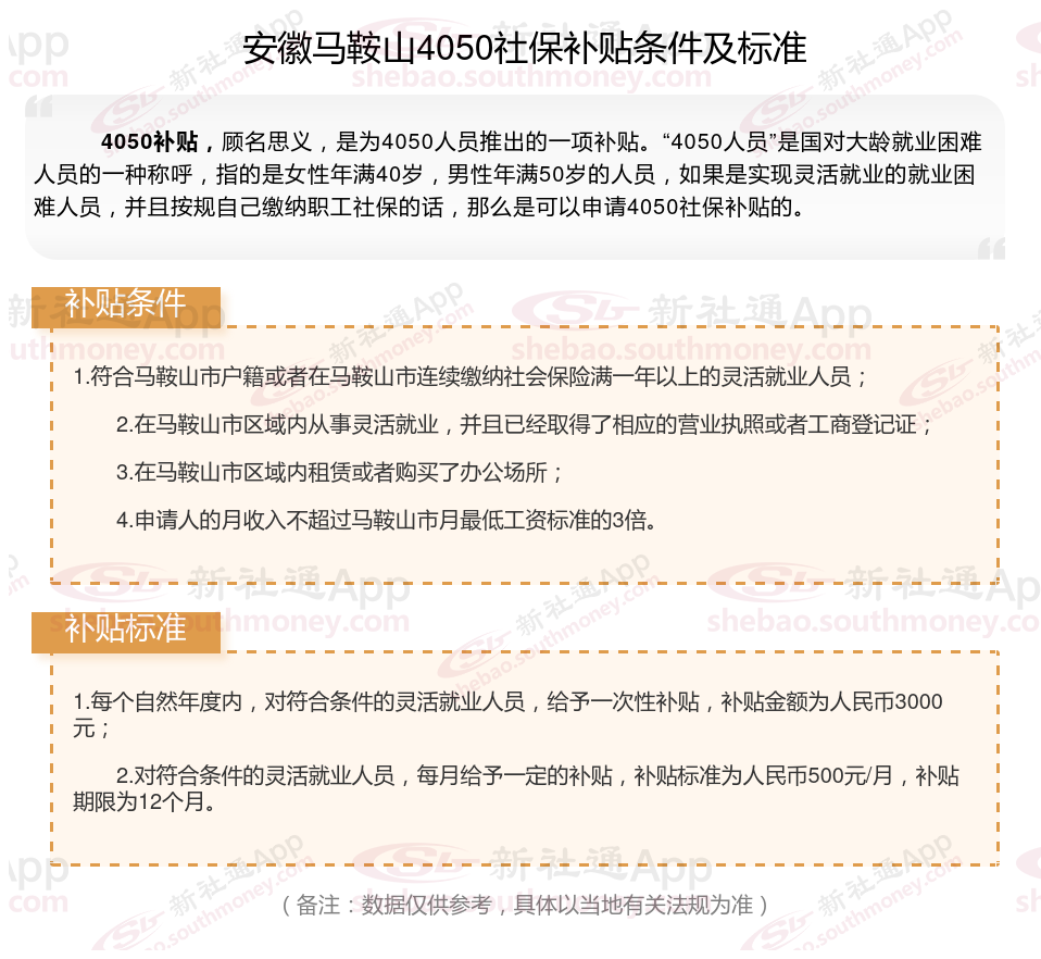 4050补贴主要是针对大龄就业困难人群的社保补贴,申请条件包括年龄、就业困难、灵活就业并自费缴纳社保,需要持有失业登记证,不同地区可能有细微差别,比如农村户口的限制。那么安徽马鞍山4050灵活就业社保补贴标准是多少钱?安徽马鞍山4050社保补贴条件是什么?接下来随新社通APP小编了解一下最新资讯。