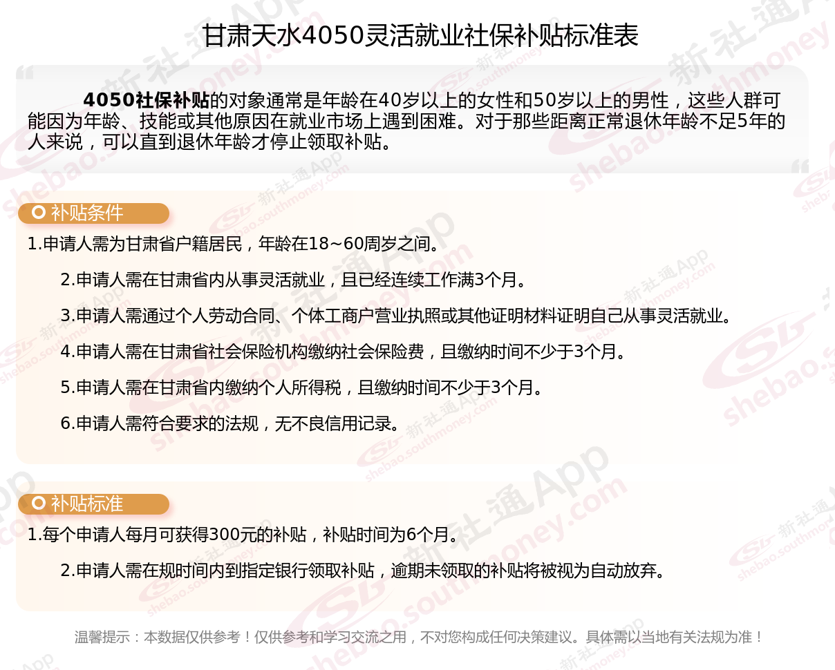 一、2025年甘肃天水4050社保补贴标准及条件是多少?