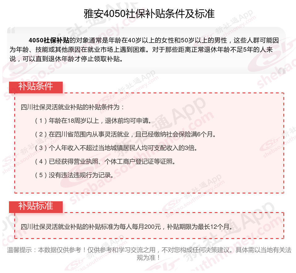 “灵活就业4050社保补贴”需要以灵活就业身份参加职工养老和医疗保险,补贴标准不超过实际缴费的三分之二,最长3年,距离退休不足5年的可延长到退休。补贴对象包括国企下岗人员、低保家庭等。申请流程需要提交身份证、银行账户等。那么雅安4050灵活就业困难人员社保补贴标准是多少?雅安4050社保补贴需要符合什么条件?接下来随新社通APP小编具体了解一下4050社保补贴内容。
