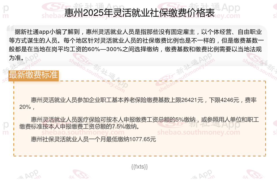 据新社通app数据显示,2024-2025年惠州灵活就业人员养老保险的缴费标准: