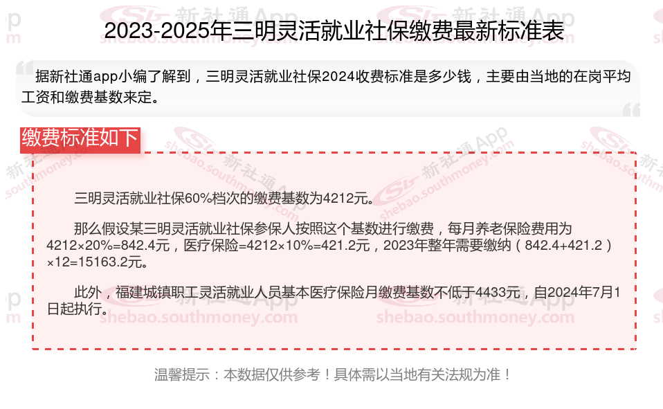 那么,三明灵活就业人员社保交多少钱?买根据新社通app-社保缴费查询工具提供的2025社保缴费标准详情数据: