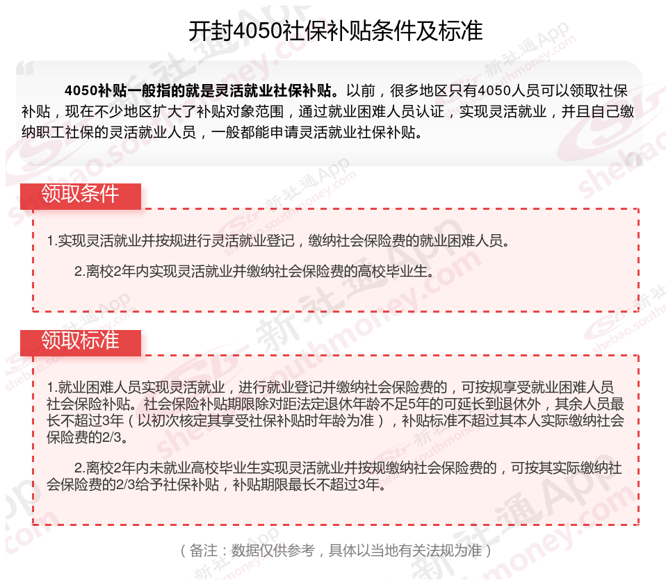 4050补贴主要是针对大龄就业困难人群的社保补贴,申请条件包括年龄、就业困难、灵活就业并自费缴纳社保,需要持有失业登记证,不同地区可能有细微差别,比如农村户口的限制。那么开封4050灵活就业社保补贴标准是多少钱?开封4050社保补贴条件是什么?接下来随新社通APP小编了解一下最新资讯。
